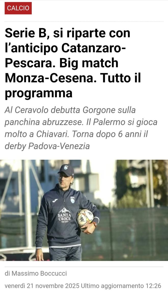 La Serie B ricomincia, dopo la sosta delle nazionali, con la 13ª giornata che si apre stasera (venerdì 21 novembre, ore 20.30) con l’anticipo Catanzaro-Pescara, per chiudersi lunedì 24 novembre con Sampdoria-Juve Stabia, sempre alle 20.30. Al Ceravolo si ripresenta la squadra di Alberto Aquilani, che ha interrotto a Empoli la serie di 3 vittorie consecutive, contro Palermo, Mantova e Venezia. Trova il Pescara che fa esordire in panchina e nei cadetti il nuovo allenatore Giorgio Gorgone, 49 anni, ex centrocampista degli stessi abruzzesi, subentrato il 12 novembre scorso all’esonerato Vincenzo Vivarini. Gorgone viene dall’esperienza in C dove ha guidato la Lucchese, portata in salvo sul campo ai playout con il Sestri Levante, nonostante i problemi societari sfociati in estate nel fallimento e nell’esclusione dal calcio professionistico.