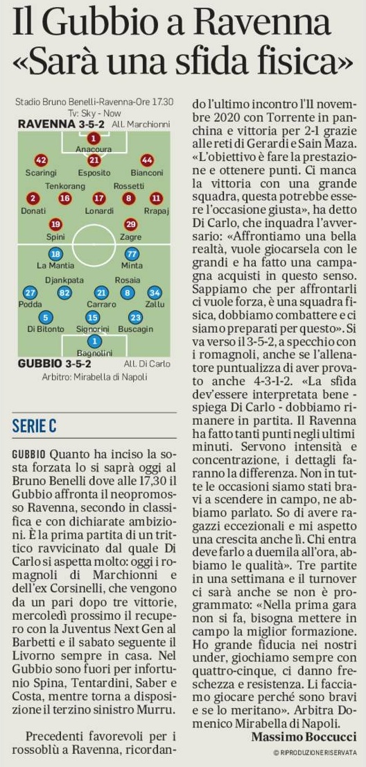 GUBBIO Quanto ha inciso la sosta forzata lo si saprà oggi al Bruno Benelli dove alle 17.30 il Gubbio affronta il neopromosso Ravenna, secondo in classifica e con dichiarate ambizioni. È la prima partita di un trittico ravvicinato dal quale Di Carlo si aspetta molto: oggi i romagnoli di Marchionni e dell’ex Corsinelli, che vengono da un pareggio dopo tre vittorie, mercoledì prossimo (ore 15) il recupero con la Juventus Next Gen al Barbetti e il sabato seguente il Livorno sempre in casa (ore 14.30). Nel Gubbio sono fuori per infortunio Spina, Tentardini, Saber e Costa, mentre torna a disposizione il terzino sinistro Murru.