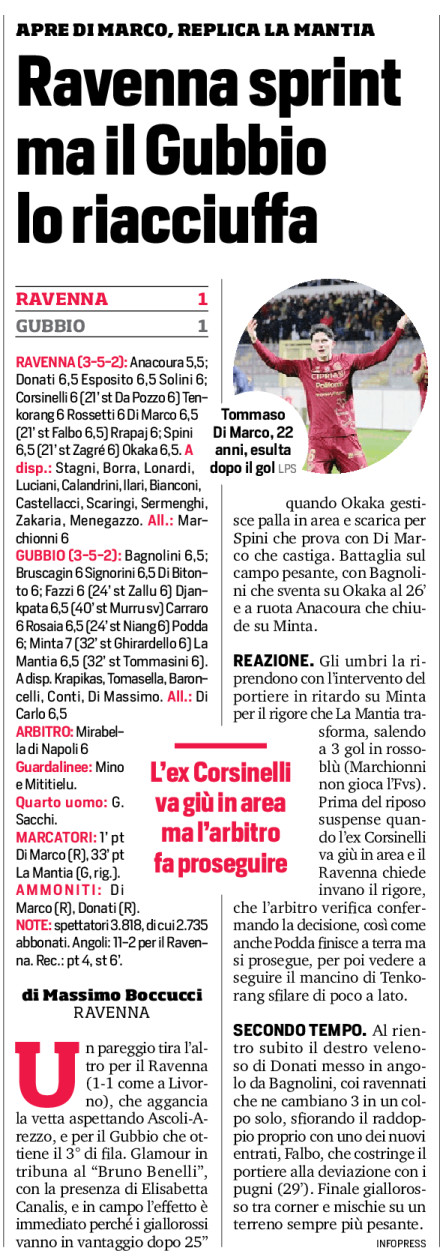 Un pareggio tira l’altro per il Ravenna (1-1 come a Livorno), che aggancia la vetta aspettando Ascoli-Arezzo, e per il Gubbio che ottiene il 3° di fila. Glamour in tribuna al “Bruno Benelli”, con la presenza di Elisabetta Canalis, e in campo l’effetto è immediato perché i giallorossi vanno in vantaggio dopo 25” quando Okaka gestisce palla in area e scarica per Spini che prova con Di Marco che castiga. Battaglia sul campo pesante, con Bagnolini che sventa su Okaka al 26’ e a ruota Anacoura che chiude su Minta.