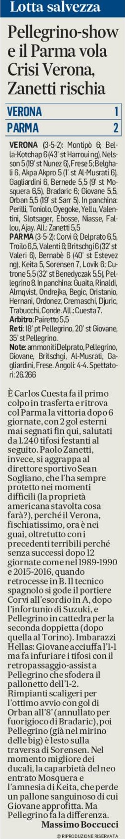 Carlos Cuesta fa il primo colpo in trasferta (il 25 maggio a Bergamo il precedente) e ritrova col Parma la vittoria dopo 6 giornate, con 2 gol esterni mai segnati fin qui salutati da 1.240 tifosi festanti al seguito. Paolo Zanetti, invece, si aggrappa al direttore sportivo Sean Sogliano, che l’ha sempre protetto nei momenti difficili (la proprietà americana stavolta cosa farà?), perché il Verona, fischiatissimo, ora è nei guai, oltretutto con i precedenti terribili perché senza successi dopo 12 giornate come nel 1989-1990 e 2015-2016 quando retrocesse in B. Il tecnico spagnolo si gode il portiere Corvi all’esordio in A, dopo l’infortunio di Suzuki, e Pellegrino in cattedra per la seconda doppietta (dopo quella al Torino). Imbarazzi Hellas: Giovane acciuffa l’1-1 ma fa infuriare i tifosi con il retropassaggio-assist a Pellegrino che sfodera il pallonetto dell’1-2. Rimpianti scaligeri per l’ottimo avvio con gol di Orban all’8’ (annullato per fuorigioco di Bradaric), poi Pellegrino (già nel mirino delle big) è lesto sulla traversa di Sorensen. Nel momento migliore dei ducali, la caparbietà del neo entrato Mosquera e l’amnesia di Keita, che perde un pallone sanguinoso di cui Giovane approfitta. Ma Pellegrino fa la differenza.