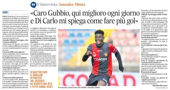 GUBBIO Quando si è accesa la luce, il campionato di Minta è cambiato. Il ventenne attaccante ghanese tiene un ritmo impressionante dal 25 ottobre scorso, a Carpi dove ha lasciato il segno. Per lui un gol e 5 assist in 4 gare positive con 6 punti tra le 11 presenze per 522 minuti giocati. Il ragazzo, arrivato in prestito dal Sassuolo, sa metterci freschezza, qualità e velocità con un dinamismo che non passa inosservato.