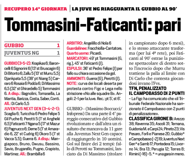 GUBBIO (3-5-2): Krapikas 6; Baroncelli 6 Signorini 6 (13’ st Bruscagin 6) Di Bitonto 6; Zallu 5 (13’ st Murru 5,5) Djankpata 5,5 (38’ pt Niang 5) Carraro 6 Rosaia 6 Podda 6; Di Massimo 6,5 (32’ st Ghirardello 5) Tommasini 6. A disp.: Bagnolini, Tomasella, La Mantia, Barizza, Costa, Saber, Conti. All.: Di Carlo 5,5