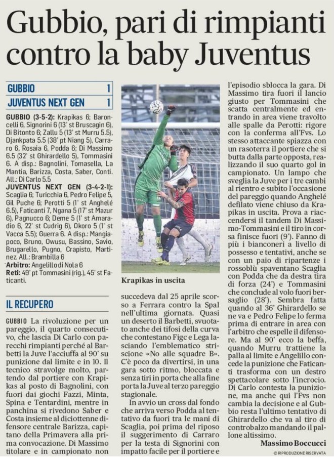 GUBBIO La rivoluzione per un pareggio, il quarto consecutivo, che lascia Di Carlo con parecchi rimpianti perché al Barbetti la Juve l‘acciuffa al 90’ su punizione dal limite e in dieci. Il tecnico stravolge molto, anche troppo, partendo dal portiere con Krapikas al posto di Bagnolini, con fuori dai giochi Fazzi, Minta, Spina e Tentardini, mentre in panchina si rivedono Saber e Costa insieme al diciottenne difensore centrale Barizza, capitano della Primavera alla prima convocazione. Di Massimo titolare e in campionato non succedeva dal 25 aprile scorso a Ferrara contro la Spal nell’ultima giornata. Quasi un deserto il Barbetti, svuotato anche dei tifosi della curva che contestano Figc e Lega lasciando l’emblematico striscione «No alle squadre B». C’è poco da divertirsi, in una gara sotto ritmo, bloccata e senza tiri in porta che alla fine porta la Juve al terzo pareggio stagionale, un risultato che non registrava da 11 giornate. In avvio un cross dal fondo che arriva verso Podda al tentativo da fuori tra le mani di Scaglia, poi prima del riposo il suggerimento di Carraro per la testa di Signorini con impatto facile per il portiere e soprattutto l’episodio che la sblocca. Di Massimo tira fuori il lancio giusto per Tommasini che scatta centralmente ed entrando in area viene travolto alle spalle da Perotti, con la conferma all’Fvs chiesto dal tecnico juventino. Lo stesso attaccante spiazza con un rasoterra il portiere che si butta dalla parte opposta, realizzando il suo 4° gol in campionato. Un lampo che sveglia la Juve per i tre cambi al rientro e subito l’occasione del pareggio quando il neo entrato Anghelé defilato viene chiuso da Krapikas in uscita. Prova a riaccendersi il tandem Di Massimo-Tommasini e il tiro in corsa finisce fuori (9’). Fanno di più i bianconeri a livello di possesso e tentativi, anche con un paio di ripartenze i rossoblù spaventano Scaglia con Podda che da destra tira di forza (24’) e Tommasini che conclude al volo fuori bersaglio (28’). Sembra fatta quando al 36’ Ghirardello se ne va e Pedro Felipe lo ferma prima di entrare in area con l’arbitro che espelle il difensore, per fallo su chiara occasione da gol, confermando la decisione quando Brambilla si gioca il secondo Fvs. Ma al 90’ ecco la beffa quando Murru trattiene la palla al limite e Angelillo concede la punizione che Faticanti trasforma con un destro spettacolare sotto l’incrocio. Di Carlo contesta la punizione, ma anche qui l’Fvs non cambia la decisione e al Gubbio resta l’ultimo tentativo di Ghirardello che va al tiro di controbalzo mandando il pallone altissimo.
