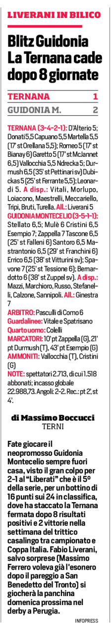 Fate giocare il neopromosso Guidonia Montecelio sempre fuori casa, visto il gran colpo per 2-1 al “Liberati” che è il 5° della serie, per un bottino di 16 punti sui 24 in classifica, dove ha staccato la Ternana fermata dopo 8 risultati positivi e 2 vittorie nella settimana del trittico casalingo tra campionato e Coppa Italia. Fabio Liverani, salvo sorprese (Massimo Ferrero voleva già l’esonero dopo il pareggio a San Benedetto del Tronto) si giocherà la panchina domenica prossima nel derby a Perugia.
