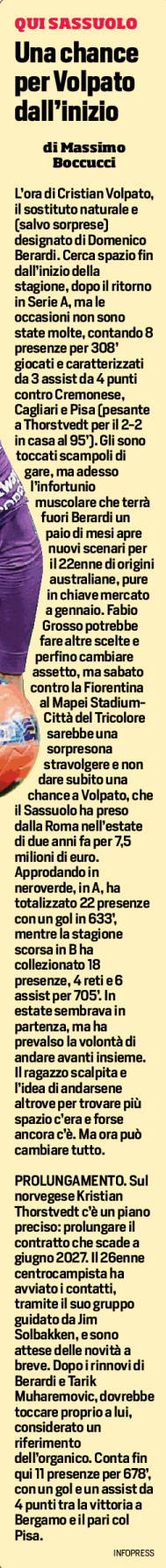 L’ora di Cristian Volpato, il sostituto naturale e (salvo sorprese) designato di Domenico Berardi. Cerca spazio fin dall’inizio della stagione, dopo il ritorno in Serie A, ma le occasioni non sono state molte, contando 8 presenze per 308’ giocati e caratterizzati da 3 assist da 4 punti contro Cremonese, Cagliari e Pisa (pesante a Thorstvedt per il 2-2 in casa al 95’). Gli sono toccati scampoli di gare, ma adesso l’infortunio muscolare che terrà fuori Berardi un paio di mesi apre nuovi scenari per il 22enne di origini australiane, pure in chiave mercato a gennaio. Fabio Grosso potrebbe fare altre scelte e perfino cambiare assetto, ma sabato contro la Fiorentina al Mapei Stadium-Città del Tricolore sarebbe una sorpresona stravolgere e non dare subito una chance a Volpato, che il Sassuolo ha preso dalla Roma nell’estate di due anni fa per 7,5 milioni di euro. Approdando in neroverde, in A, ha totalizzato 22 presenze con un gol in 633’, mentre la stagione scorsa in B ha collezionato 18 presenze, 4 reti e 6 assist per 705’. In estate sembrava in partenza, ma ha prevalso la volontà di andare avanti insieme. Il ragazzo scalpita e l’idea di andarsene altrove per trovare più spazio c’era e forse ancora c’è. Ma ora può cambiare tutto.