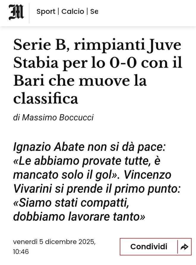 La classifica del Bari non è migliorata granché, però Vincenzo Vivarini prende il meglio del pareggio a Castellammare: «Non è tanto il risultato positivo, che è importante perché venire a fare punti qua è cosa non da poco, quanto il fatto che da parte nostra ci siamo comportati bene.Siamo stati compatti, con spirito battagliero e di sacrificio. È importante tutto questo per ripartire. Sono sicuro che si potrà migliorare ancora tanto e bene. C’è da migliorare tantissimo. Conosco molto bene l’organizzazione di gioco della Juve Stabia e senza attenzione avremmo corso il rischio che arrivassero in porta molto più facilmente. Siamo stati un po’ troppo contratti nella prima frazione, quindi abbiamo preso più consapevolezza. La fase di sviluppo non l’ho ancora toccata e ci siamo affidati alle individualità. Proseguiamo col nostro lavoro. I problemi sono diversi e da qui al mercato ci sono ancora tante partite. Ci sono tutti i presupposti per lavorare bene. Dobbiamo pensare molto al campo, lasciamo perdere il contorno e ciò che gira intorno alla squadra. Bisogna prendere fiducia, divertirsi». Adesso la sfida con il Pescara che Vivarini ha allenato prima di approdare a Bari: «Non guardo i social, Pescara è il mio cuore e la mia città ma non sempre si può trovare professionalità».