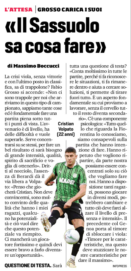 La crisi viola, senza vittorie e con l’ultimo posto in classifica, sa di trappolone? Fabio Grosso si accende: «Non ci sono trappole per noi che arriviamo in questo tipo di campionato, sappiamo tante cose ed è fondamentale fare una partita piena sotto tutti i punti di vista. L’avversario è di livello, ha delle difficoltà e vuole superarle. Serve concentrarsi su se stessi, per fare un bel risultato ci sarà bisogno di grande intensità, qualità, spirito di sacrificio e voglia di ottenerlo». Dritti al nocciolo, l’assenza di Berardi dà il via libera a Volpato: «Penso che giocherà Cristian. Non deve convincermi, sono molto convinto delle qualità che hanno i miei ragazzi, qualcuno ha potenzialità e ciò vuol dire che questo potenziale va riempito. Ci mancherà un giocatore fortissimo e quindi devi essere bravo a farlo diventare un’opportunità».