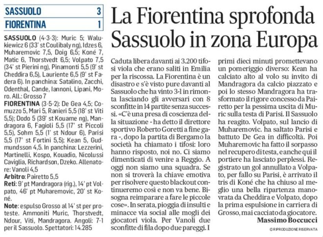 Caduta libera davanti ai 3.200 tifosi viola che erano saliti in Emilia per la riscossa. La Fiorentina è un disastro e s’è visto pure davanti al Sassuolo che ha vinto 3-1 in rimonta lasciando gli avversari con 8 sconfitte in 14 partite senza successi. «C’è una presa di coscienza della situazione – ha detto il direttore sportivo Roberto Goretti a fine gara -, dopo la partita di Bergamo la società ha chiamato i tifosi: loro hanno risposto, noi no. Ci siamo dimenticati di venire a Reggio. A oggi non siamo una squadra. Se non si troverà la chiave emotiva per risolvere questo blackout continueremo così e non va bene. Bisogna reimparare a fare le piccole cose». In serata, pioggia di insulti via social alle mogli dei giocatori viola. Per Vanoli due sconfitte di fila dopo due pareggi. I primi dieci minuti promettevano un pomeriggio diverso: Kean ha calciato alto al volo su invito di Mandragora da calcio piazzato e poi lo stesso Mandragora ha trasformato il rigore concesso da Pairetto per la pessima uscita di Muric sulla testa di Parisi. Il Sassuolo ha reagito. Volpato, sul lancio di Muharemovic. ha saltato Parisi e battuto De Gea in difficoltà. Poi Muharemovic ha fatto il sorpasso nel recupero di testa, e anche qui il portiere ha lasciato perplessi. Registrato un gol annullato a Volpato, per fallo su Parisi, è arrivato il tris di Koné che ha chiuso al meglio una bella ripartenza manovrata da Cheddira e Volpato, dopo la prima espulsione in carriera di Grosso, mai cacciato da giocatore.