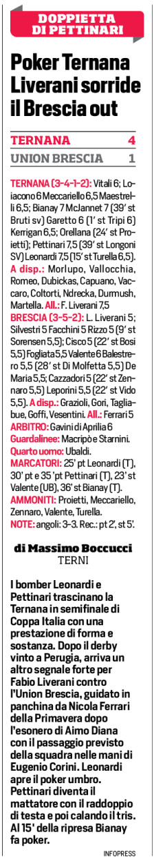 I bomber Leonardi e Pettinari trascinano la Ternana in semifinale di Coppa Italia con una prestazione di forma e sostanza. Dopo il derby vinto a Perugia, arriva un altro segnale forte per Fabio Liverani contro l’Union Brescia, guidato in panchina da Nicola Ferrari della Primavera dopo l’esonero di Aimo Diana con il passaggio previsto della squadra nelle mani di Eugenio Corini. Leonardi apre il poker umbro. Pettinari diventa il mattatore con il raddoppio di testa e poi calando il tris. Al 15′ della ripresa Bianay fa poker.
