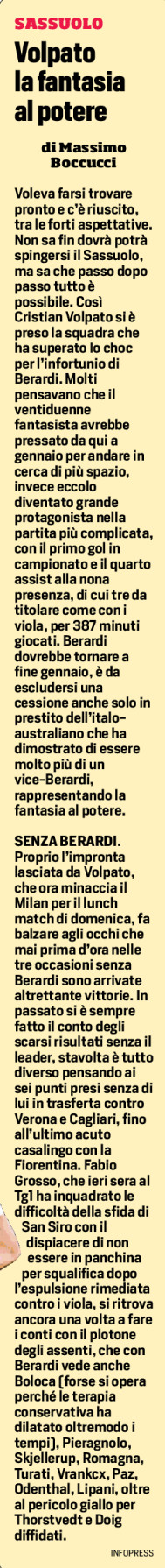 SENZA BERARDI. Proprio l’impronta lasciata da Volpato, che ora minaccia il Milan per il lunch match di domenica, fa balzare agli occhi che mai prima d’ora nelle tre occasioni senza Berardi sono arrivate altrettante vittorie. In passato si è sempre fatto il conto degli scarsi risultati senza il leader, stavolta è tutto diverso pensando ai sei punti presi senza di lui in trasferta contro Verona e Cagliari, fino all’ultimo acuto casalingo con la Fiorentina. Fabio Grosso, che ieri sera al Tg1 ha inquadrato le difficoltà della sfida di San Siro con il dispiacere di non essere in panchina per squalifica dopo l’espulsione rimediata contro i viola, si ritrova ancora una volta a fare i conti con il plotone degli assenti, che con Berardi vede anche Boloca (forse si opera perché le terapia conservativa ha dilatato oltremodo i tempi), Pieragnolo, Skjellerup, Romagna, Turati, Vrankcx, Paz, Odenthal, Lipani, oltre al pericolo giallo per Thorstvedt e Doig diffidati.