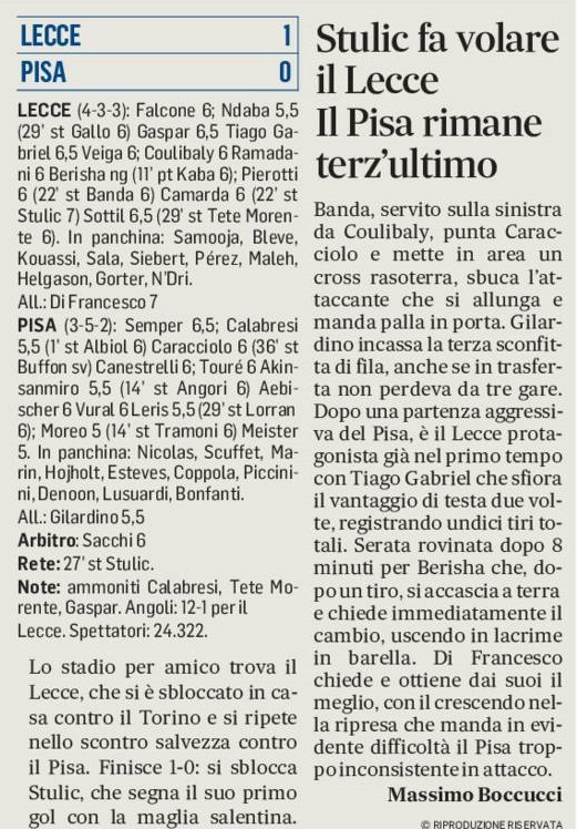 Lo stadio per amico trova il Lecce, che si è sbloccato in casa contro il Torino e si ripete nello scontro salvezza contro il Pisa. Finisce 1-0: si sblocca Stulic, che segna il suo primo gol con la maglia salentina. Banda, servito sulla sinistra da Coulibaly, punta Caracciolo e mette in area un cross rasoterra, sbuca l’attaccante che si allunga e manda palla in porta. Gilardino incassa la terza sconfitta di fila, anche se in trasferta non perdeva da tre gare. Dopo una partenza aggressiva del Pisa, è il Lecce protagonista già nel primo tempo con Tiago Gabriel che sfiora il vantaggio di testa due volte, registrando undici tiri totali. Serata rovinata dopo 8 minuti per Berisha che, dopo un tiro, si accascia a terra e chiede immediatamente il cambio, uscendo in lacrime in barella. Di Francesco chiede e ottiene dai suoi il meglio, con il crescendo nella ripresa che manda in evidente difficoltà il Pisa troppo inconsistente in attacco.