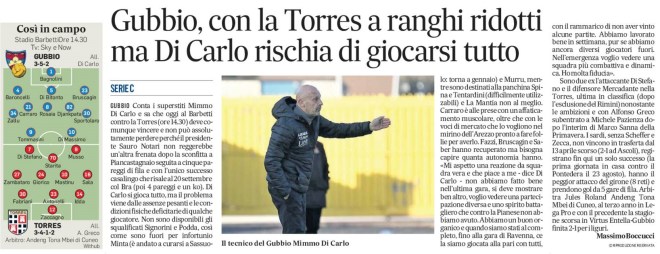 GUBBIO Conta i superstiti Mimmo Di Carlo e sa che oggi al Barbetti contro la Torres (ore 14.30) deve comunque vincere e non può assolutamente perdere perché il presidente Sauro Notari non reggerebbe un’altra frenata dopo la sconfitta a Piancastagnaio seguita a cinque pareggi di fila e con l’unico successo casalingo che risale al 20 settembre col Bra (poi 4 pareggi e un ko). Di Carlo si gioca tutto, ma il problema viene dalle assenze pesanti e le condizioni fisiche deficitarie di qualche giocatore. Non sono disponibili gli squalificati Signorini e Podda, così come sono fuori per infortunio Minta (è andato a curarsi a Sassuolo: torna a gennaio) e Murru, mentre sono destinati alla panchina Spina e Tentardini (difficilmente utilizzabili) e La Mantia non al meglio. Carraro è alle prese con un affaticamento muscolare, oltre che con le voci di mercato che lo vogliono nel mirino dell’Arezzo pronto a fare follie per averlo. Fazzi, Bruscagin e Saber hanno recuperato ma bisogna capire quanta autonomia hanno. «Mi aspetto una reazione da squadra vera e che piace a me – dice Di Carlo -, non abbiamo fatto bene nell’ultima gara, si deve mostrare ben altro, voglio vedere una partecipazione diversa e uno spirito battagliero che contro la Pianese non abbiamo avuto. Abbiamo un buon organico e quando siamo stati al completo, fino alla gara di Ravenna, ce la siamo giocata alla pari con tutti, con il rammarico di non aver vinto alcune partite. Abbiamo lavorato bene in settimana, pur se abbiamo ancora diversi giocatori fuori. Nell’emergenza voglio vedere una squadra più combattiva e dinamica. Ho molta fiducia».