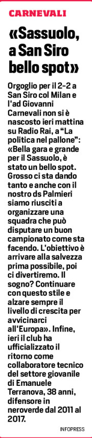 Orgoglio per il 2-2 a San Siro col Milan e l’ad Giovanni Carnevali non si è nascosto ieri mattina su Radio Rai, a “La politica nel pallone”: «Bella gara e grande per il Sassuolo, è stato un bello spot. Grosso ci sta dando tanto e anche con il nostro ds Palmieri siamo riusciti a organizzare una squadra che può disputare un buon campionato come sta facendo. L’obiettivo è arrivare alla salvezza prima possibile, poi ci divertiremo. Il sogno? Continuare con questo stile e alzare sempre il livello di crescita per avvicinarci all’Europa». Infine, ieri il club ha ufficializzato il ritorno come collaboratore tecnico del settore giovanile di Emanuele Terranova, 38 anni, difensore in neroverde dal 2011 al 2017.
