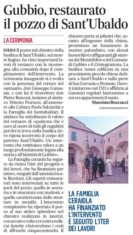GUBBIO Il pozzo nel chiostro della basilica di Sant’Ubaldo, sul monte Ingino, ha visto importanti lavori di restauro con la riconsegna alla comunità dopo il completamento dell’intervento. La cerimonia inaugurale si è svolta con la presenza del rettore del santuario, don Giuseppe Ganassin, e con lui il vicerettore don Pietro Benozzi, insieme al sindaco Vittorio Fiorucci, all’assessore alla Cultura Paola Salciarini e la Famiglia dei Santubaldari. Il sindaco ha sottolineato il valore del restauro di «qualcosa che è caro al cuore di tutti gli eugubini perché si trova nella basilica dove riposa incorrotto il corpo del patrono Sant’Ubaldo. Un intervento che restituisce valore a un luogo profondamente legato alla storia e all’identità di Gubbio».