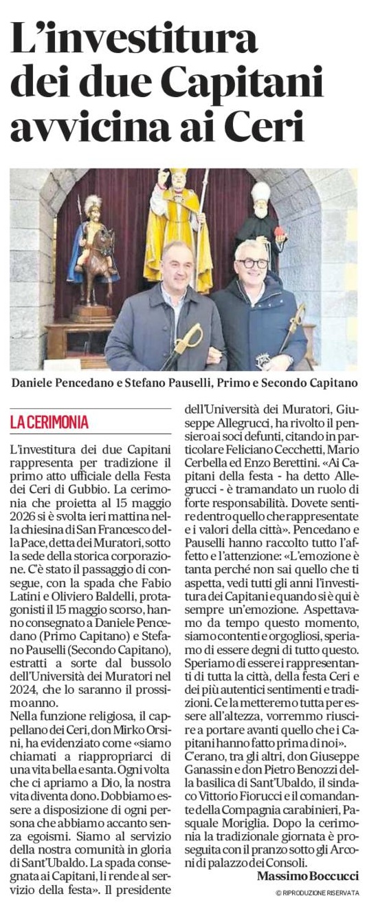 GUBBIO L’investitura dei due Capitani rappresenta per tradizione il primo atto ufficiale della Festa dei Ceri. La cerimonia che proietta al 15 maggio 2026 si è svolta ieri mattina nella chiesina di San Francesco della Pace, detta dei Muratori, sotto la sede della storica corporazione. C’è stato il passaggio di consegue, con la spada che Fabio Latini e Oliviero Baldelli, protagonisti il 15 maggio scorso, hanno consegnato a Daniele Pencedano (Primo Capitano) e Stefano Pauselli (Secondo Capitano), estratti a sorte dal bussolo dell’Università dei Muratori nel 2024, che lo saranno il prossimo anno.