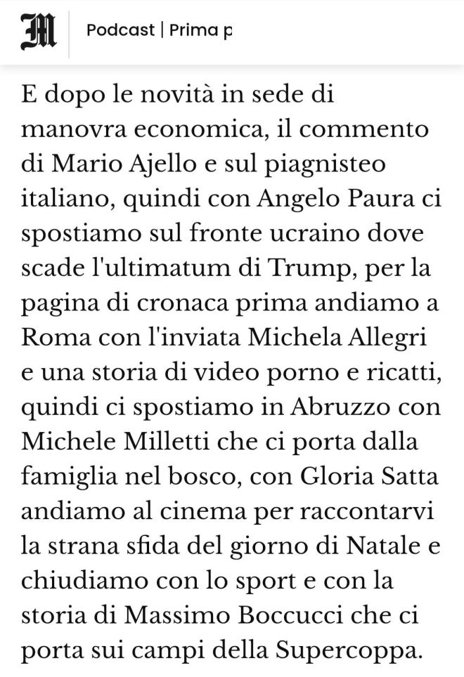 La finale della Supercoppa Italiana è la partita Napoli-Bologna che si sarebbe dovuta giocare, senza tante alchimie, tra la squadra che ha vinto lo scudetto e quella che si è aggiudicata la Coppa Italia. Appuntamento domani sera alle 20, con diretta televisiva su Italia Uno. Non c’era bisogno di inventarsi la formula per metterci dentro pure il detentore del trofeo e perfino la seconda classificata in campionato che non ci azzecca nulla, così come si maldigerisce la disputa a Riyad.