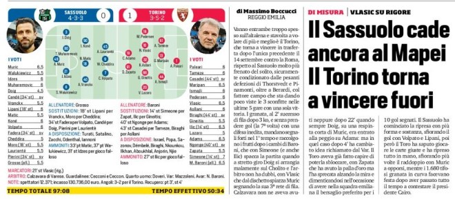 Vanno entrambe troppo spesso sull’altalena e stavolta a volare di più e meglio è il Torino, che torna a vincere in trasferta dopo l’unica precedente il 14 settembre contro la Roma, rispetto al Sassuolo molto più frenato del solito, sicuramente condizionato dalle pesanti defezioni di Thorstvedt e Pinamonti, oltre a Berardi, col fattore campo che sta dando poco viste le 3 sconfitte nelle ultime 5 gare con una sola vittoria. I granata, al 2° successo di fila dopo 3 ko, e senza prendere gol (la 7ª volta) con una difesa inedita, mandano segnali forti nel 1° tempo e raccolgono i frutti dopo i cambi di Baroni, che con Simeone (e anche Ilic) spacca la partita quando a stretto giro Doig si arrangia malamente sul Cholito e l’arbitro non ha dubbi, con Vlasic che dal dischetto spiazza Muric segnando la sua 3ª rete di fila. Calzavara non ne aveva avuti neppure dopo 22’ quando sempre Doig, su una respinta corta di Muric, era entrato alla peggio su Adams: ma in quel caso dopo 4’ ha cambiato idea richiamato dal Var. Il Toro aveva già fatto capire di poterla sbloccare, con Zapata che ha avuto la palla d’oro ma l’ha sprecata alzando la mira e dimenticandosi nell’occasione di avere nella squadra emiliana il bersaglio preferito per i 10 gol segnati. Il Sassuolo ha cominciato la ripresa con più forma e sostanza, sfiorando il gol con Volpato e Lipani, poi però il Toro ha saputo giocare le carte giuste e ha ripreso tutto in mano, sfiorando più volte il raddoppio con Muric a opporsi, mentre i 1.680 tifosi granata in curva facevano festa dopo aver passato tutto il tempo a contestare il presidente Cairo.