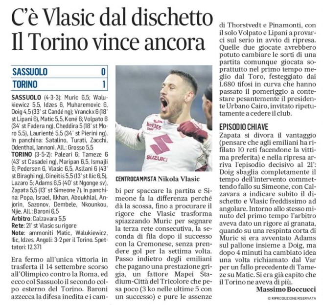 Era fermo all’unica vittoria in trasferta il 14 settembre scorso all’Olimpico contro la Roma, ed ecco col Sassuolo il secondo colpo esterno del Torino. Baroni azzecca la difesa inedita e i cambi per spaccare la partita e Simeone fa la differenza perché dà la scossa, fino a procurare il rigore che Vlasic trasforma spiazzando Muric per segnare la terza rete consecutiva, la seconda di fila dopo il successo con la Cremonese, senza prendere gol per la settima volta. Passo indietro degli emiliani che pagano una prestazione grigia, un fattore Mapei Stadium-Città del Tricolore che pesa poco (3 ko nelle ultime 5 con un successo) e pure le assenze di Thorstvedt e Pinamonti, con il solo Volpato e Lipani a provarci sul serio in avvio di ripresa. Quelle due giocate avrebbero potuto cambiare le sorti di una partita comunque giocata soprattutto nel primo tempo meglio dal Toro, festeggiato dai 1.680 tifosi in curva che hanno passato il pomeriggio a contestare pesantemente il presidente Urbano Cairo, invitato ripetutamente a cedere il club.