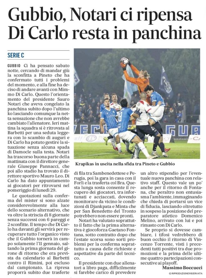 Le quotazioni sulla conferma del mister si sono alzate considerevolmente alla luce dello scenario alternativo, che va oltre la striscia di 8 giornate senza successi con 6 pareggi e 2 sconfitte. Il tempo che Di Carlo ha davanti gli servirà per recuperare tutto l’organico visto che il Gubbio tornerà in campo solamente l’11 gennaio, saltando la prima giornata del girone di ritorno che era prevista da calendario al Barbetti contro il Rimini, poi escluso dal campionato. La ripresa proporrà subito due trasferte di fila tra Sambenedettese e Perugia, poi la gara in casa con il Forlì e la trasferta col Bra. Questa lunga sosta consente il recupero dei giocatori, tra infortunati e acciaccati, dovendo monitorare da vicino le condizioni di Djankpata e Minta che per San Benedetto del Tronto potrebbero non essere pronti. Notari ha valutato soprattutto il fatto che la prima alternativa è giocoforza Gaetano Fontana, sotto contratto dopo che l’estate scorsa sono sorti problemi per la conferma soprattutto a causa delle richieste e aspettative da parte del tecnico.