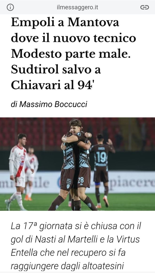 Nella prima delle due gare del pomeriggio era pronta a festeggiare il successo la Virtus Entella, nello scontro diretto per la salvezza col Sudtirol. Al Sannazzari di Chiavari gli altoatesini la riprendono al 94’. La partita è stata spezzettata e nervosa, con l’avvio degli ospiti insidiosi con l’ex Merkaj, accolto dagli applausi, poi Karic al 28’ cade in area e l’Entella reclama invano il rigore. Prima del riposo Franzoni sferra un destro potente da una ventina metri che, complice una leggera deviazione di Kofler, costringe Adamonis alla respinta di petto. Veseli rinvia corto sulla destra, dove Bariti crossa per Debenedetti, abile a schiacciare in rete di testa. Nella ripresa il Sudtirol reagisce ma non riesce a portare particolari pericolosi, fino al guizzo nel finale quando si accende una mischia furibonda e nel batti e ribatti i difensori dell’Entella rinviano con poca precisione, favorendo El Kouakibi, che fa da torre per il subentrato Odogwu impietoso col suo rasoterra mancino da pochi metri per portare il 4° pareggio consecutivo. La Serie B dà appuntamento con il boxing day il 26 e 27 dicembre per la 18ª giornata.