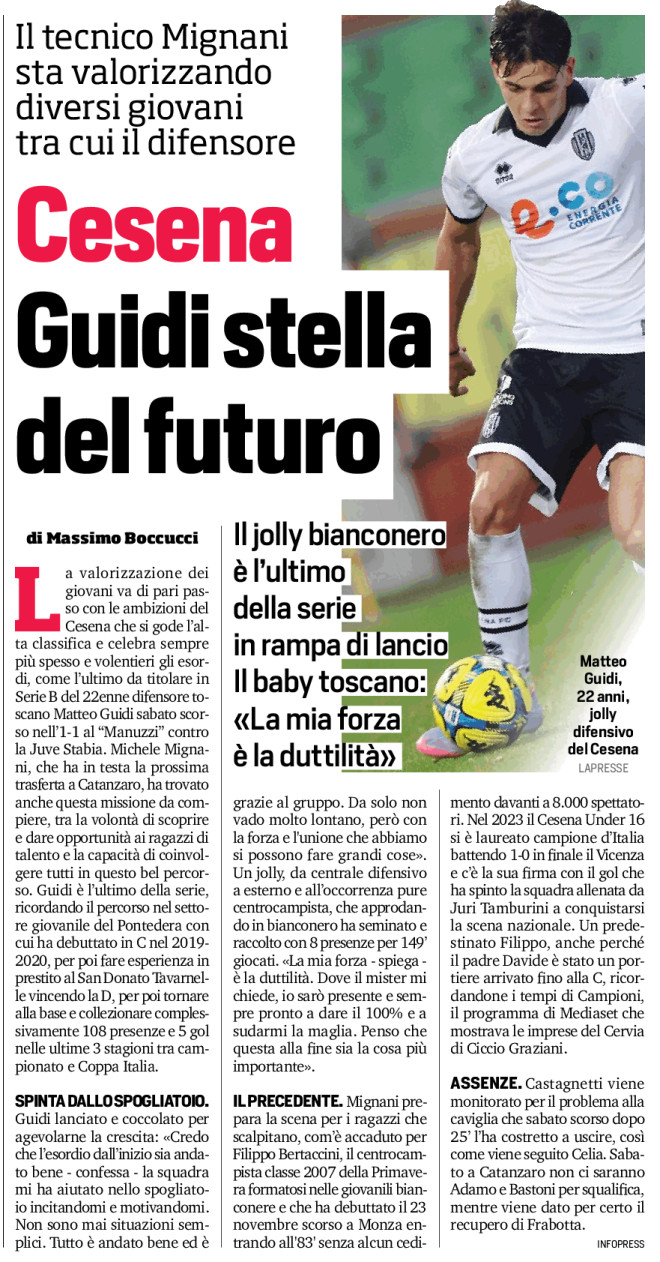 La valorizzazione dei giovani va di pari passo con le ambizioni del Cesena che si gode l’alta classifica e celebra sempre più spesso e volentieri gli esordi, come l’ultimo da titolare in Serie B del 22enne difensore toscano Matteo Guidi sabato scorso nell’1-1 al “Manuzzi” contro la Juve Stabia. Michele Mignani, che ha in testa la prossima trasferta a Catanzaro, ha trovato anche questa missione da compiere, tra la volontà di scoprire e dare opportunità ai ragazzi di talento e la capacità di coinvolgere tutti in questo bel percorso. Guidi è l’ultimo della serie, ricordando il percorso nel settore giovanile del Pontedera con cui ha debuttato in C nel 2019-2020, per poi fare esperienza in prestito al San Donato Tavarnelle vincendo la D, per poi tornare alla base e collezionare complessivamente 108 presenze e 5 gol nelle ultime 3 stagioni tra campionato e Coppa Italia.