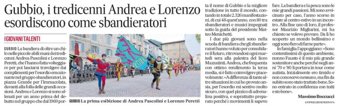 I due più giovani sono nella scuola di bandiera che gli sbandieratori hanno voluto per consolidare il futuro, ritrovandosi ogni martedì sera alla palestra del liceo Mazzatinti. Andrea, che frequenta con ottimo rendimento la terza media, si è fatto coinvolgere piacevolmente: «A differenza di tante altre situazioni in cui ho provato ansia, per l’esordio mi sentivo molto sicuro, con quel pizzico di adrenalina positiva, e soprattutto preparato perché i movimenti li sapevo fare. La bandiera e la pesca sono le mie grandi passioni. Mi sono avvicinato per caso, l’anno scorso in estate al centro estivo in un incontro. Alla fine uno di loro, il professor Maurizio Migliarini, mi ha chiesto se volevo provare. Da lì ho scoperto un mondo bellissimo e oggi sono fiero di farne parte».