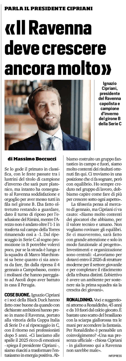 COSE BUONE. Ignazio Cipriani e i soci della Black Duck hanno fatto cose buone da quando con dichiarate ambizioni hanno preso in mano il Ravenna, portato alla vittoria della Coppa Italia di Serie D e al ripescaggio in C, con il ritorno nei professionisti dopo 5 anni. «Ci lasciamo alle spalle il 2025 ricco di emozioni – spiega il presidente Cipriani -, siamo riusciti a trasformare l’entusiasmo in energia positiva. Abbiamo costruito un gruppo fantastico in campo e fuori, siamo molto contenti dei risultati ottenuti fin qui. Ci troviamo in una posizione che ci fa sognare, però con equilibrio. Ho sempre creduto nel gruppo di lavoro, dobbiamo capire come fare di più per crescere sotto ogni aspetto».
