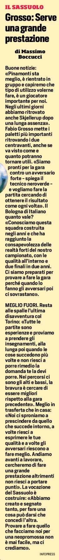 Buone notizie: «Pinamonti sta meglio, è rientrato in gruppo e capiremo che tipo di utilizzo volerne fare, è un giocatore importante per noi. Negli ultimi giorni abbiamo ritrovato anche Skjellerup dopo una lunga assenza». Fabio Grosso mette i paletti più importanti ritrovando i due centravanti, anche se va visto come e quanto potranno tornare utili. «Siamo pronti per la gara contro un avversario forte – spiega il tecnico neroverde – e vogliamo fare la partita cercando di ottenere il risultato come ogni volta». Il Bologna di Italiano quanto vale? «Conosciamo questa squadra costruita negli anni e che ha raggiunto la consapevolezza delle realtà forti del nostro campionato, con le qualità all’interno e due finali in due anni. Ci siamo preparati per provare a fare la gara perché quando lo fanno gli avversari poi ci sovrastano».