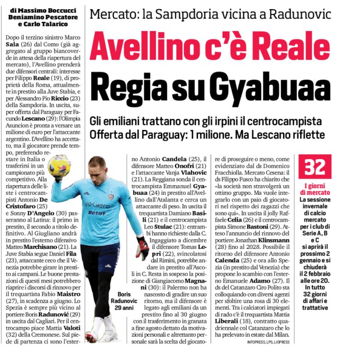 Dopo il terzino sinistro Marco Sala (26) dal Como (già aggregato al gruppo biancoverde in attesa della riapertura del mercato), l’Avellino prenderà due difensori centrali: interesse per Filippo Reale (19), di proprietà della Roma, attualmente in prestito alla Juve Stabia, e per Alessandro Pio Riccio (23) della Sampdoria. In uscita, super offerta dal Paraguay per Facundo Lescano (29): l’Olimpia Asuncion è pronta a versare un milione di euro per l’attaccante argentino. L’Avellino ha accettato, ma il giocatore prende tempo, preferendo restare in Italia o trasferirsi in un campionato più competitivo. Alla riapertura delle liste i centrocampisti Antonio De Cristofaro (25) e Sonny D’Angelo (30) passeranno al Latina: il primo in prestito, il secondo a titolo definitivo. Al Giugliano andrà in prestito l’esterno difensivo Matteo Marchisano (21). La Juve Stabia segue Daniel Fila (23), attaccante ceco che il Venezia potrebbe girare in prestito ai campani. Le buone prestazioni di questi mesi potrebbero riaprire i discorsi di rinnovo per il trequartista Fabio Maistro (27), in scadenza a giugno. Lo Spezia è sempre più vicino al portiere Boris Radunović (29) in uscita dal Cagliari. Per il centrocampo piace Mattia Valoti (32) della Cremonese. Sul piede di partenza ci sono l’esterno Antonio Candela (25), il difensore Matteo Onofri (21) e l’attaccante Vanja Vlahovic (21). La Reggiana sonda il centrocampista Emmanuel Gyabuaa (24) in prestito all’Avellino dall’Atalanta e cerca un attaccante di peso. In uscita il trequartista Damiano Basili (21) e il centrocampista Leo Stulac (21): entrambi hanno richieste dalla C. Ingaggiato a dicembre il difensore Tomas Lepri (22), svincolatosi dal Rimini, potrebbe andare in prestito all’Ascoli in C. Resta in sospeso la posizione di Giangiacomo Magnani (30): il Palermo non ha nascosto di gradire un suo ritorno, ma il difensore è legato agli emiliani da un prestito fino al 30 giugno con il trasferimento in granata a fine agosto dettato da motivazioni personali e altrettanto personale sarà la scelta del giocatore di proseguire o meno, come evidenziato dal ds Domenico Fracchiolla. Mercato Cesena: il ds Filippo Fusco ha chiarito che «la società non stravolgerà un ottimo gruppo. Ma vuole integrarlo con un paio di giocatori nel rispetto dei ragazzi che sono qui». In uscita il jolly Raffaele Celia (26) e il centrocampista Simone Bastoni (29). Atteso l’annuncio del rinnovo del portiere Jonathan Klinsmann (28) fino al 2028. Possibile il ritorno del difensore Antonio Calenda (25) e ora allo Spezia (in prestito dal Venezia) che propone lo scambio con l’esterno Emanuele Adamo (27). Il ds del Catanzaro Ciro Polito sta colloquiando con diversi agenti per sfoltire una rosa di 30 elementi. Tra i calciatori impiegati di rado c’è il trequartista Mattia Liberali (18), contratto quadriennale col Catanzaro che lo ha prelevato in estate dal Milan.