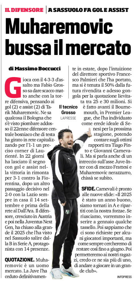 QUOTAZIONE. Muharemovic è un uomo mercato. La Juve l’ha ceduto definitivamente in estate, dopo l’intuizione del direttore sportivo Francesco Palmieri che l’ha portato, ma si è tenuta il 50% dalla futura rivendita e adesso gongola per la quotazione lievitata tra 25 e 30 milioni. Si è fatto avanti il Bournemouth, in Premier League, che l’ha individuato come erede ideale di Senesi per la prossima stagione, potendo contare sugli ottimi rapporti tra Tiago Pinto e Giovanni Carnevali. Ma si parla anche di un intreccio sull’asse Juve-Inter con di mezzo Frattesi e Muharemovic nerazzurro, chissà se subito.