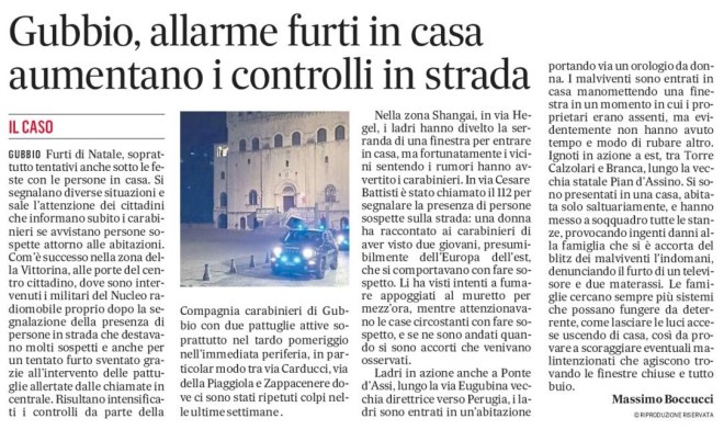 GUBBIO Furti di Natale, soprattutto tentativi anche sotto le feste con le persone in casa. Si segnalano diverse situazioni e sale l’attenzione dei cittadini che informano subito i carabinieri se avvistano persone sospette aggirarsi attorno alle abitazioni. Com’è successo nella zona della Vittorina, alle porte del centro cittadino, dove sono intervenuti i militari del Nucleo radiomobile proprio dopo la segnalazione della presenza di persone in strada che destavano molti sospetti e anche per un tentato furto sventato proprio grazie all’intervento delle pattuglie allertate dalle chiamate in centrale. Risultano intensificati i controlli da parte della Compagnia carabinieri di Gubbio con due pattuglie attive soprattutto nel tardo pomeriggio e nell’immediata periferia, in particolar modo nell’area tra via Carducci, via della Piaggiola e Zappacenere dove ci sono stati ripetuti colpi nelle ultime settimane tra la crescente apprensione dei residenti che non hanno nascosto le preoccupazioni.