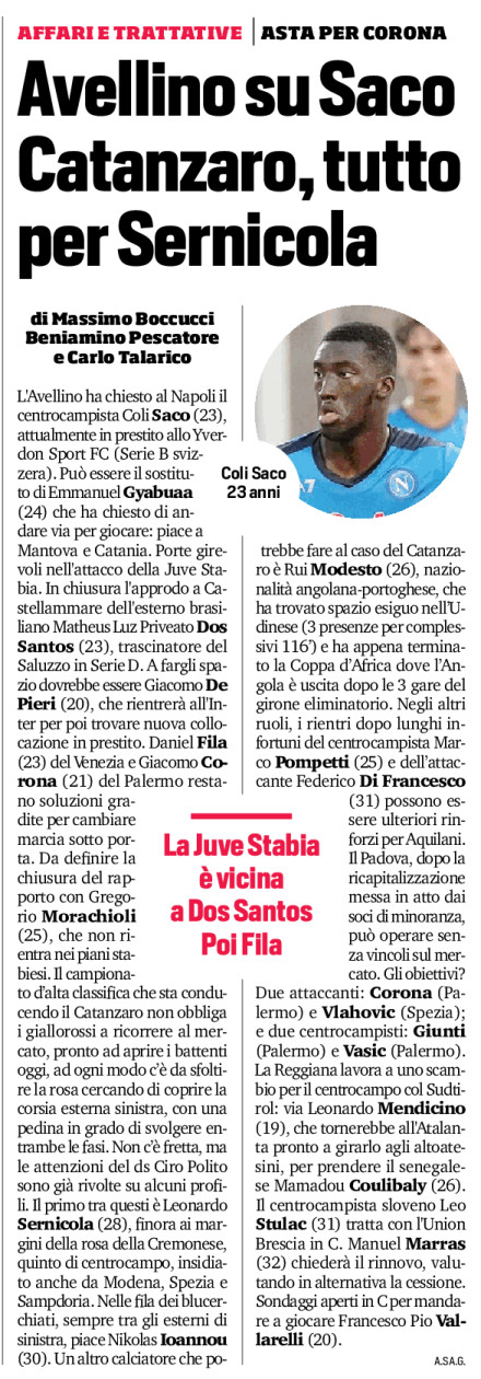 L’Avellino ha chiesto al Napoli il centrocampista Coli Saco (23), attualmente in prestito allo Yverdon Sport FC (Serie B svizzera). Può essere il sostituto di Emmanuel Gyabuaa (24) che ha chiesto di andare via per giocare: piace a Mantova e Catania. Porte girevoli nell’attacco della Juve Stabia. In chiusura l’approdo a Castellammare dell’esterno brasiliano Matheus Luz Priveato Dos Santos (23), trascinatore del Saluzzo in Serie D. A fargli spazio dovrebbe essere Giacomo De Pieri (20), che rientrerà all’Inter per poi trovare nuova collocazione in prestito. Daniel Fila (23) del Venezia e Giacomo Corona (21) del Palermo restano soluzioni gradite per cambiare marcia sotto porta. Da definire la chiusura del rapporto con Gregorio Morachioli (25), che non rientra nei piani stabiesi. Il campionato d’alta classifica che sta conducendo il Catanzaro non obbliga i giallorossi a ricorrere al mercato, pronto ad aprire i battenti oggi, ad ogni modo c’è da sfoltire la rosa cercando di coprire la corsia esterna sinistra, con una pedina in grado di svolgere entrambe le fasi. Non c’è fretta, ma le attenzioni del ds Ciro Polito sono già rivolte su alcuni profili. Il primo tra questi è Leonardo Sernicola (28), finora ai margini della rosa della Cremonese, quinto di centrocampo, insidiato anche da Modena, Spezia e Sampdoria. Nelle fila dei blucerchiati, sempre tra gli esterni di sinistra, piace Nikolas Ioannou (30). Un altro calciatore che potrebbe fare al caso del Catanzaro è Rui Modesto (26), nazionalità angolana-portoghese, che ha trovato spazio esiguo nell’Udinese (3 presenze per complessivi 116’) e ha appena terminato la Coppa d’Africa dove l’Angola è uscita dopo le 3 gare del girone eliminatorio. Negli altri ruoli, i rientri dopo lunghi infortuni del centrocampista Marco Pompetti (25) e dell’attaccante Federico Di Francesco (31) possono essere ulteriori rinforzi per Aquilani. Il Padova, dopo la ricapitalizzazione messa in atto dai soci di minoranza, può operare senza vincoli sul mercato. Gli obiettivi? Due attaccanti: Corona (Palermo) e Vlahovic (Spezia); e due centrocampisti: Giunti (Palermo) e Vasic (Palermo). La Reggiana lavora a uno scambio per il centrocampo col Sudtirol: via Leonardo Mendicino (19), che tornerebbe all’Atalanta pronto a girarlo agli altoatesini, per prendere il senegalese Mamadou Coulibaly (26). Il centrocampista sloveno Leo Stulac (31) tratta con l’Union Brescia in C. Manuel Marras (32) chiederà il rinnovo, valutando in alternativa la cessione. Sondaggi aperti in C per mandare a giocare Francesco Pio Vallarelli (20).