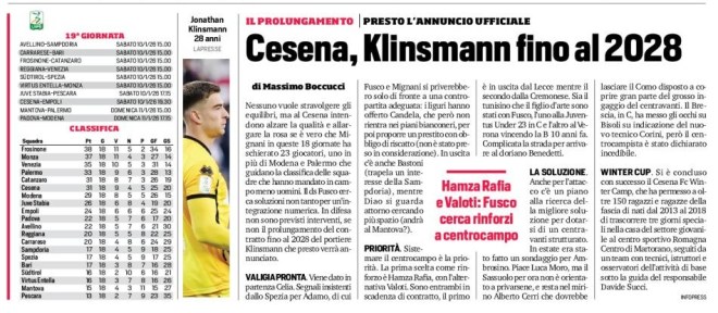 Nessuno vuole stravolgere gli equilibri, ma al Cesena intendono alzare la qualità e allargare la rosa se è vero che Mignani in queste 18 giornate ha schierato 23 giocatori, uno in più di Modena e Palermo che guidano la classifica delle squadre che hanno mandato in campo meno uomini. Il ds Fusco cerca soluzioni non tanto per un’integrazione numerica. In difesa non sono previsti interventi, se non il prolungamento del contratto fino al 2028 del portiere Klinsmann che presto verrà annunciato.