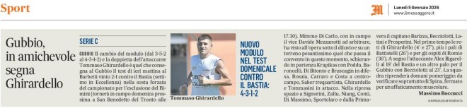 GUBBIO Il cambio del modulo (dal 3-5-2 al 4-3-1-2) e la doppietta dell’attaccante Tommaso Ghirardello è quel che consegna al Gubbio il test di ieri mattina al Barbetti vinto 2-1 contro il Bastia (settimo in Eccellenza) nella sosta forzata del campionato per l’esclusione del Rimini (tornerà in campo domenica prossima a San Benedetto del Tronto alle 17.30). Mimmo Di Carlo, con in campo il vice Davide Mezzanotti ad arbitrare, ha visto all’opera sotto il diluvio e su un terreno pesantissimo quel che passa il convento in questo momento, schierando in partenza Krapikas con Podda, Baroncelli, Di Bitonto e Bruscagin in difesa, Rosaia, Carraro e Costa a centrocampo, Saber trequartista, Ghirardello e Tommasini in attacco. Nella ripresa confermato l’assetto tattico e spazio a Signorini, Zallu, Niang, Conti, Di Massimo, Sportolaro e dalla Primavera il capitano Barizza, Becciolotti, Latini e Prosperini. Nel primo tempo le reti di Ghirardello (4’ e 27’), più i pali in scivolata di Battistelli sul tiro di Di Bitonto (26’) e per gli ospiti di Romio (36’). Nella ripresa a segno l’attaccante Alex Bigarelli al 18’ del Bastia e un altro palo per il Gubbio con Becciolotti al 23’. La squadra riprenderà domani pomeriggio: da verificare le condizioni degli assenti e soprattutto di Spina, che si è fermato nuovamente per un affaticamento muscolare.