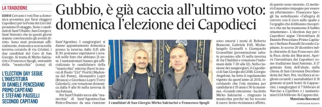 GUBBIO Cercano i voti fino a domenica prossima per farsi eleggere Capodieci per la Festa dei Ceri del prossimo 15 maggio. Sono i candidati di Sant’Ubaldo, San Giorgio e Sant’Antonio che in questi giorni stanno convincendo gli aventi diritto. Sono stati presentati ufficialmente, domenica scorsa nella taverna ceraiola di via Cristini, i due candidati del Cero di San Giorgio. Si tratta di Mirko Salciarini e Francesco Spogli, entrambi della “manicchia” (zona) di Sant’Agostino. I sangiorgiari si danno appuntamento domenica presso la taverna dalle 8.15 alle 11.30: potranno esprimersi i ceraioli nelle liste che abbiano 21 anni. I santantoniari hanno già ufficializzato le candidature della “manicchia” esterna (fuori le mura) di Paolo “Ciri” Fioriti (Madonna del Ponte), Alessandro Lepri (Branca) e Giordano Lepri (Torre Calzolari), con votazione domenica dalla 9 alle 16 nella taverna di via Fabiani.