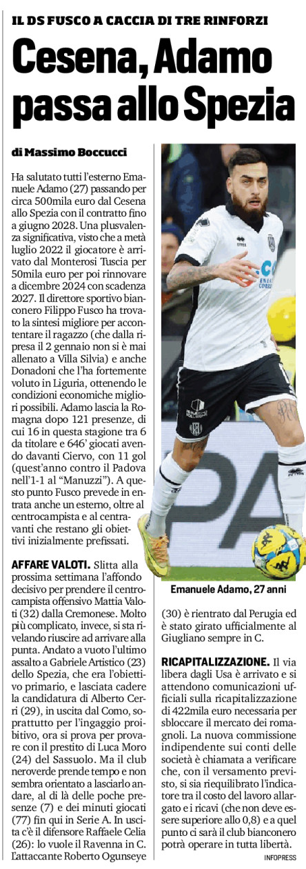 Ha salutato tutti l’esterno Emanuele Adamo (27) passando per circa 500mila euro dal Cesena allo Spezia con il contratto fino a giugno 2028. Una plusvalenza significativa, visto che a metà luglio 2022 il giocatore è arrivato dal Monterosi Tuscia per 50mila euro per poi rinnovare a dicembre 2024 con scadenza 2027. Il direttore sportivo bianconero Filippo Fusco ha trovato la sintesi migliore per accontentare il ragazzo (che dalla ripresa il 2 gennaio non si è mai allenato a Villa Silvia) e anche Donadoni che l’ha fortemente voluto in Liguria, ottenendo le condizioni economiche migliori possibili. Adamo lascia la Romagna dopo 121 presenze, di cui 16 in questa stagione tra 6 da titolare e 646’ giocati avendo davanti Ciervo, con 11 gol (quest’anno contro il Padova nell’1-1 al “Manuzzi”). A questo punto Fusco prevede in entrata anche un esterno, oltre al centrocampista e al centravanti che restano gli obiettivi inizialmente prefissati.
