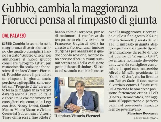 GUBBIO Cambia lo scenario nella maggioranza di centrodestra dopo che quattro consiglieri hanno lasciato Gubbio Civica per annunciare il nuovo gruppo consiliare Progetto Città, pur restando nella coalizione che sostiene il sindaco Vittorio Fiorucci. Potrebbe essere il preludio a un rimpasto in giunta, anche perché ora gli equilibri sono mutati con Progetto Città diventato forza di maggioranza relativa davanti a Gubbio Civica, Fratelli d’Italia e Forza Italia che esprimono tre consiglieri ciascuno, e la Lega con due. Nancy Latini, Sandro Manca, Mauro Biccari e Viviana Ceccarini (subentrata a Vittorio Tasso dimessosi a fine ottobre) hanno colto di sorpresa, pur se di malumori si vociferava da tempo, tanto che il vicesindaco Francesco Gagliardi (Fdi) ha chiesto a Fiorucci una riunione d’urgenza per analizzare il quadro dopo lo scossone, mentre sono previste d’ora in avanti summit settimanali della coalizione per indirizzare il sindaco. Si tratta del secondo cambio di casacca nella maggioranza, ricordando quello a fine agosto 2024 di Chiara Generotti passata da Fdi a Fi. Il rimpasto in giunta aleggia e qualora vi sia questo tipo di rivendicazione da parte di uno dei quattro di Progetto Città, l’eventuale nominato dovrebbe dimettersi da consigliere comunale e in quel caso entrerebbe Alfredo Minelli, presidente di Gubbio Civica, che ha firmato con Robert Satiri il documento al vetriolo contro i fuoriusciti. Sulla vicenda hanno preso posizione fortemente critica i LeD (Liberi e Democratici), che oggi sono all’opposizione e persero pezzi nel precedente mandato mentre governavano.