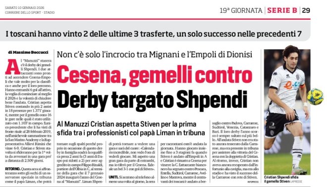 Al “Manuzzi” stasera c’è il derby dei gemelli Shpendi. I due attaccanti sono pronti ad accendere Cesena-Empoli che vale molto per la classifica e anche per il loro percorso. Hanno entrambi 6 gol all’attivo, la voglia di cominciare al meglio il 2026 e la volontà di chiudere bene l’andata. Cristian aspetta Stiven contando in più 2 assist in 18 presenze per 1.371’ giocati, mentre per il gemello sono 16 le gare nelle quali è stato utilizzato con 1.103’ in campo. L’unico precedente che li ha visti di fronte risale al 28 febbraio 2019, nell’amichevole sammarinese tra la San Marino Academy e la Rappresentativa Allievi Rimini che vinse 6-0. Cristian e Stiven stavolta si sfideranno per la 1ª volta da avversari in una gara pro’ a distanza di 2.509 giorni.
