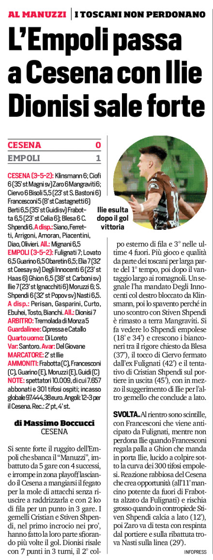 EMPOLI (3-5-2): Fulignati 7; Lovato 6,5 Guarino 6,5 Obaretin 6,5; Elia 7 (32’ st Ceesay sv) Degli Innocenti 6 (23’ st Haas 6) Ghion 6,5 (38’ st Carboni sv) Ilie 7 (23’ st Ignacchiti 6) Moruzzi 6; S. Shpendi 6 (32’ st Popov sv) Nasti 6,5. A disp.: Perisan, Gasparini, Curto, Ebuhei, Tosto, Bianchi. All.: Dionisi 7
