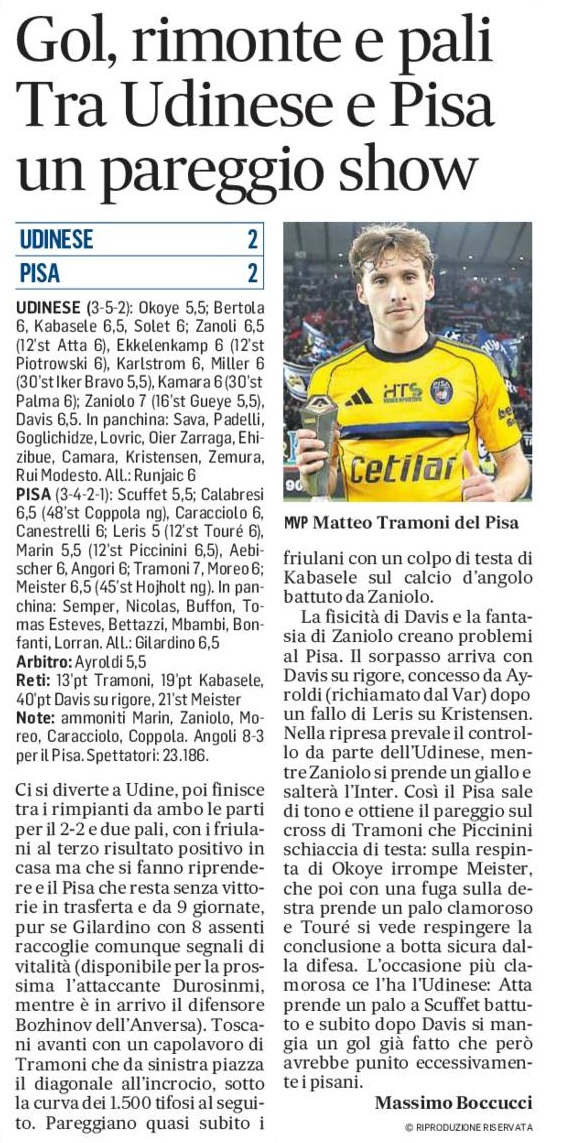 Ci si diverte a Udine, poi finisce tra i rimpianti da ambo le parti per il 2-2 e due pali, con i friulani al terzo risultato positivo in casa ma che si fanno riprendere e il Pisa che resta senza vittorie in trasferta e da 9 giornate, pur se Gilardino con 8 assenti raccoglie comunque segnali di vitalità (disponibile per la prossima l’attaccante Durosinmi, mentre è in arrivo il difensore Bozhinov dell’Anversa). Toscani avanti con un capolavoro di Tramoni che da sinistra piazza il diagonale all’incrocio, sotto la curva dei 1.500 tifosi al seguito. Pareggiano quasi subito i friulani con un colpo di testa di Kabasele sul calcio d’angolo battuto da Zaniolo.