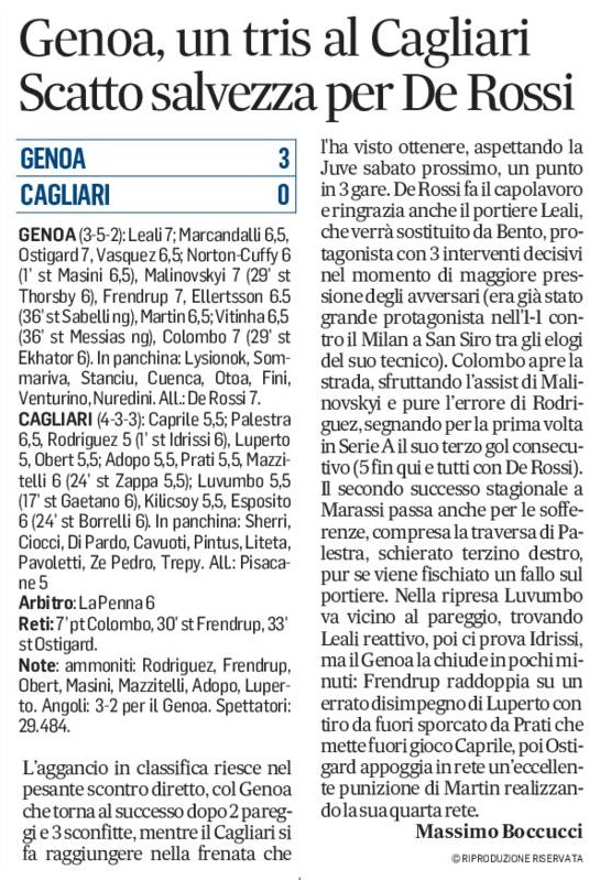 L’aggancio in classifica riesce nel pesante scontro diretto, col Genoa che torna al successo dopo 2 pareggi e 3 sconfitte, mentre il Cagliari si fa raggiungere nella frenata che l’ha visto ottenere, aspettando la Juve sabato prossimo, un punto in 3 gare. De Rossi fa il capolavoro e ringrazia anche il portiere Leali, che verrà sostituito da Bento, protagonista con 3 interventi decisivi nel momento di maggiore pressione degli avversari (era già stato grande protagonista nell’1-1 contro il Milan a San Siro tra gli elogi del suo tecnico). Colombo apre la strada, sfruttando l’assist di Malinovskyi e pure l’errore di Rodriguez, segnando per la prima volta in Serie A il suo terzo gol consecutivo (5 fin qui e tutti con De Rossi). Il secondo successo stagionale a Marassi passa anche per le sofferenze, tra diversi brividi, compresa la traversa di Palestra, schierato terzino destro, pur se viene fischiato un fallo sul portiere. Nella ripresa Luvumbo va vicino al pareggio su lancio di Esposito, trovando Leali reattivo, poi ci prova Idrissi, ma il Genoa la chiude in pochi minuti: Frendrup raddoppia su un errato disimpegno di Luperto con tiro da fuori sporcato da Prati che mette fuori gioco Caprile, poi Ostigard appoggia in rete un’eccellente punizione di Martin realizzando la sua quarta rete.