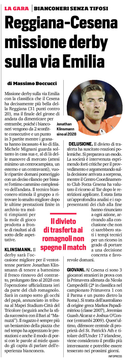 KLINSMANN. Il derby sarà l’occasione migliore per il ventottenne portiere Jonathan Klinsmann di tenere a battesimo il fresco rinnovo del contratto, prolungato fino al 2028 con l’operazione ufficializzata ieri da parte del club romagnolo. Sarà in campo sotto gli occhi del papà, annunciato in tribuna al Mapei Stadium-Città del Tricolore (seguirà anche la sfida successiva con il Bari al “Manuzzi”). Il ragazzo è sempre più un beniamino della piazza che nel tempo ha apprezzato le prestazioni e anche il modo di porsi con le parole al miele quando gli capita di parlare dell’esperienza bianconera.