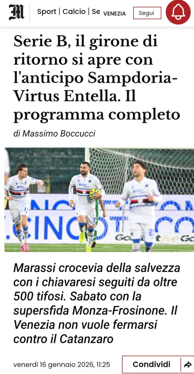Si apre il girone di ritorno nel campionato di Serie B e l’anticipo del venerdì (16 gennaio), per la 20ª giornata, fa accendere le luci dello stadio Ferraris di Genova per il derby tra la Sampdoria, reduce dalla sconfitta di Avellino e sempre nei guai in classifica, e la Virtus Entella, avanti di 2 punti e che viene dal successo sul Monza. All’andata la vittoria per 3-1 a Chiavari dell’Entella, che stasera sarà seguita a Marassi da oltre 500 tifosi. L’allenatore virtussino Andrea Chiappella esalta il valore di questa sfida e il peso specifico: «Ci aspetta una partita storica. Loro partiranno forte, dovremo gestire le emozioni. Per noi è fondamentale muovere la classifica. La settimana è stata positiva, quando si arriva da una vittoria si lavora meglio, ma dobbiamo essere bravi a dimenticarcela subito».