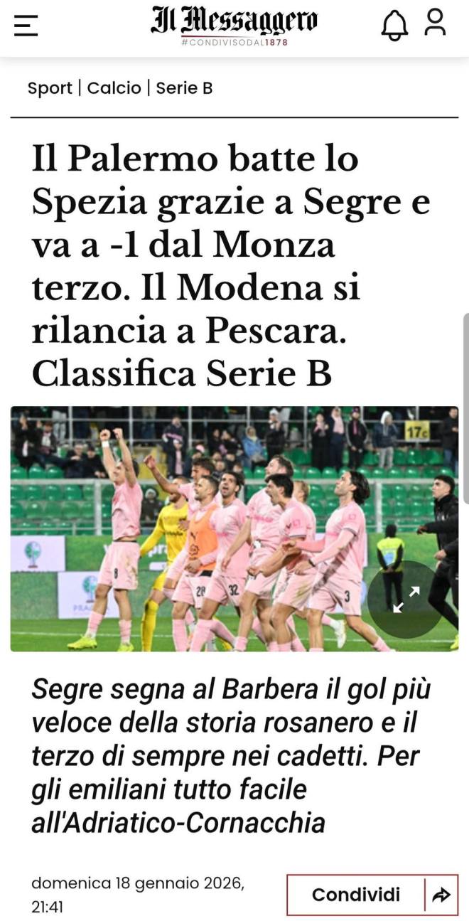 Rosicchia terreno il Palermo al Monza 3° in classifica e adesso avanti di un solo punto, dopo che i siciliani hanno battuto per 1-0 lo Spezia nell’ultimo posticipo della 20ª giornata in Serie B, la 1ª di ritorno. Al Barbera, per la 5ª vittoria interna di fila, bastano otto tocchi del pallone in una decina di secondi ai rosanero per sbloccare e ipotecare il successo. Augello lancia lungo per Pierozzi, che tocca di testa per Pohjanpalo, il quale va di sponda col tacco per Segre che segna con un micidiale tiro al volo. Il Palermo mette a segno il gol più veloce della propria storia ed è il 3° di sempre nei cadetti. La squadra di Pippo Inzaghi, sostituito in panchina per squalifica dal vice Maurizio, D’Angelo sfiora il raddoppio in un paio d’occasioni, ma rischia pure di subire il pareggio. Si rivelano decisivi i portieri Joronen e Radunovic, poi nella ripresa segna Artistico al 70’ per gli ospiti di Roberto Donadoni, ma la rete viene annullata per fuorigioco. Le Douaron sfiora il raddoppio ma la conclusione viene fermata dalla traversa, seguita pochi istanti dopo dal palo di Bani, mentre in pieno recupero è Artistico a far tremare il legno.