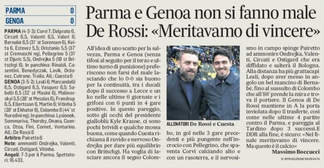 All’idea di uno scatto per la salvezza, Parma e Genoa (senza tifosi al seguito per il terzo e ultimo turno di punizione) preferiscono non farsi del male lasciando che lo 0-0 sia buono per la continuità, tra i ducali dopo il successo a Lecce e un ko nelle ultime 6 giornate e i grifoni con 6 punti in 4 gare positive. In questo pareggio, sotto gli occhi del presidente gialloblù Kyle Krause che sabato ha seguito Parma-Milan femminile e poi inaugurato il “Serafino Lounge” allo stadio, ci sono pochi brividi e qualche mossa buona, come quando Cuesta richiama il ruvido e nervoso Ondrejka per dare più equilibrio con Britschgi. Ha voglia di lasciare ancora il segno Colombo, in gol nelle 3 gare precedenti e più pungente nell’incrocio con Pellegrino, che spaventa Corvi calciando alto e con un rasoterra, e il nervosismo in campo spinge Pairetto ad ammonire Ondrejka, Valenti, Circati e Ostigard che era diffidato e salterà il Bologna. Alla distanza ha più grattacapi Leali, dopo aver messo in angolo un bel mancino di Bernabè, fino al sussulto di Colombo che all’88’ prende la mira e trova il portiere. Il Genoa mantiene in A la porta inviolata dopo 11 trasferte, così come nelle ultime 4 partite contro il Parma, e pareggia al Tardini dopo 3 successi. E DDR alla fine è sicuro: «Nel finale meritavamo di vincere. Ma questo è il calcio».