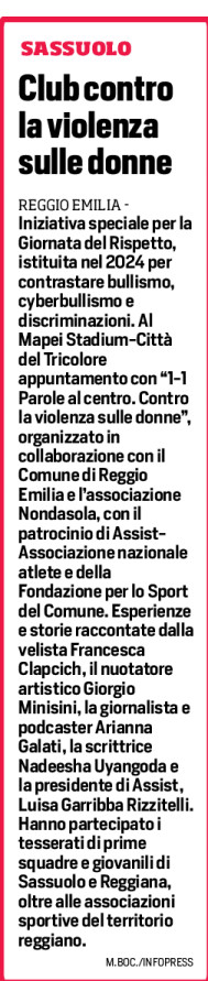 REGGIO EMILIA – Iniziativa speciale per la Giornata del Rispetto, istituita nel 2024 per contrastare bullismo, cyberbullismo e discriminazioni. Al Mapei Stadium-Città del Tricolore appuntamento con “1-1 Parole al centro. Contro la violenza sulle donne”, organizzato in collaborazione con il Comune di Reggio Emilia e l’associazione Nondasola, con il patrocinio di Assist-Associazione nazionale atlete e della Fondazione per lo Sport del Comune. Esperienze e storie raccontate dalla velista Francesca Clapcich, il nuotatore artistico Giorgio Minisini, la giornalista e podcaster Arianna Galati, la scrittrice Nadeesha Uyangoda e la presidente di Assist, Luisa Garribba Rizzitelli. Hanno partecipato i tesserati di prime squadre e giovanili di Sassuolo e Reggiana, oltre alle associazioni sportive del territorio reggiano.