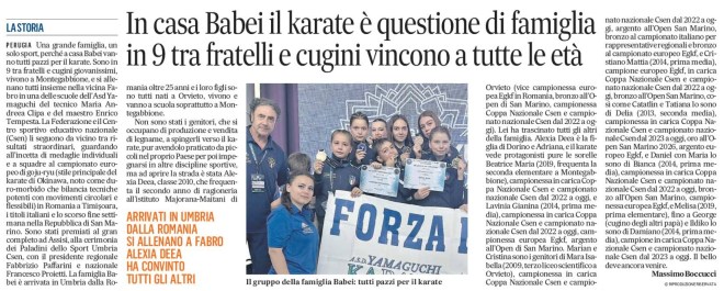 PERUGIA Una grande famiglia, un solo sport, perché a casa Babei vanno tutti pazzi per il karate. Sono in 9 tra fratelli e cugini giovanissimi, vivono a Montegabbione, e si allenano tutti insieme nella vicina Fabro in una delle scuole dell’Asd Yamaguchi del tecnico Maria Andreea Clipa e del maestro Enrico Tempesta. La Federazione Fijlkam e il Centro sportivo educativo nazionale (Csen) li seguono da vicino tra risultati straordinari, guardando all’incetta di medaglie individuali e a squadre al campionato europeo di goju-ryu (stile principale del karate di Okinawa, noto come duro-morbido che bilancia tecniche potenti con movimenti circolari e flessibili) in Romania a Timișoara, i titoli italiani e lo scorso fine settimana nella Repubblica di San Marino. Sono stati premiati al gran completo ad Assisi, alla cerimonia dei Paladini dello Sport Umbria Csen, con il presidente regionale Fabbrizio Paffarini e nazionale Francesco Proietti. La famiglia Babei è arrivata in Umbria dalla Romania oltre 25 anni e i loro figli sono tutti nati a Orvieto, vivono e vanno a scuola soprattutto a Montegabbione.