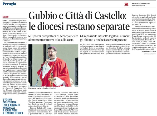 Paolucci Bedini dal 7 maggio 2022 è stato incaricato di presiedere anche la diocesi tifernate, dopo il pensionamento di Domenico Cancian, che aveva ha compiuto 75 anni il 6 aprile. L’unione “in persona episcopi” delle due diocesi era stato considerato il passaggio preparatorio all’accorpamento per stessa ammissione del vescovo, che da quasi tre anni si divide a metà lasciando su Gubbio molto spazio operativo al vicario generale, don Mirko Orsini. In Alto Tevere il vicario generale diocesano è don Andrea Czortek, nominato nel febbraio 2023. A metà ottobre dello scorso anno era stato lo stesso Paoluci Bedini a prospettare l’imminente fusione e c’erano già dei segnali che sarebbe rimasto lui a guidare la diocesi unica. Il vescovo marchigiano aveva rivelato come l’accorpamento sia nelle cose, dovendosi decidere soltanto come e quando. Questa prospettiva gli era stata indicata a suo tempo da Papa Francesco, evidenziando come il riassetto delle diocesi sul territorio nazionale sia legato soprattutto a una questione di numeri, tra abitanti e sacerdoti in calo. Ora la questione è in capo a Papa Leone XIV.