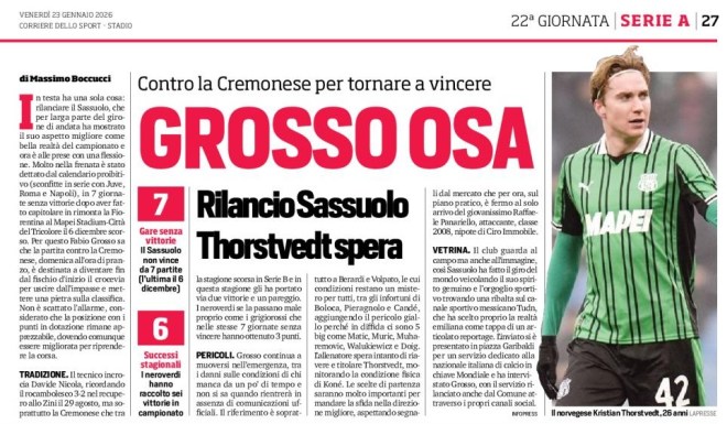 In testa ha una sola cosa: rilanciare il Sassuolo, che per larga parte del girone di andata ha mostrato il suo aspetto migliore come bella realtà del campionato e ora è alle prese con una flessione. Molto nella frenata è stato dettato dal calendario proibitivo (sconfitte in serie con Juve, Roma e Napoli), in 7 giornate senza vittorie dopo aver fatto capitolare in rimonta la Fiorentina al Mapei Stadium-Città del Tricolore il 6 dicembre scorso. Per questo Fabio Grosso sa che la partita contro la Cremonese, domenica all’ora di pranzo, è destinata a diventare fin dal fischio d’inizio il crocevia per uscire dall’impasse e mettere una pietra sulla classifica. Non è scattato l’allarme, considerato che la posizione con i punti in dotazione rimane apprezzabile, dovendo comunque essere migliorata per riprendere la corsa.