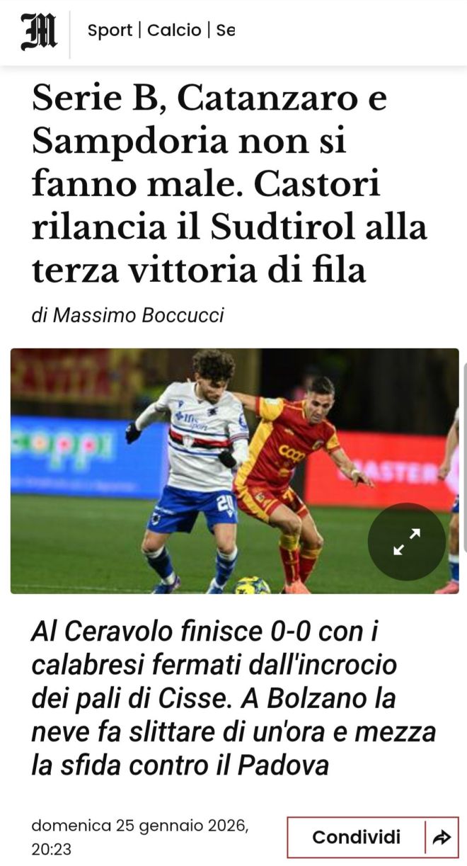Nell’ultimo posticipo della 21ª giornata in Serie B hanno finito senza farsi del male Catanzaro e Sampdoria al Ceravolo, dov’è finita 0-0. Nel 1° tempo si sono resi più pericolosi i blucerchiati. L’opportunità più nitida è stata un doppio colpo di testa, prima di Abildgaard e poi di Vita, entrambi respinti da Pigliacelli. Nella ripresa partenza forte dei calabresi, che prima impegnano Martinelli in una doppia parata su Pittarello e pochi minuti dopo con una grande giocata di Cisse sono fermati dall’incrocio dei pali. Verso la fine salva il risultato Pigliacelli su colpo di testa di Depaoli. Si tratta del 4° pareggio consecutivo in B e i doriani hanno allungato l’imbattibilità contro i giallorossi (una vittoria e 3 pari. La Samp non vince in trasferta da 25 partite nei cadetti (il Cosenza tra il 2021 e il 2022 è arrivato a 28). I calabresi pareggiano dopo una striscia di 2 sconfitte e 5 vittorie, mentre per i liguri è il 2° di fila.